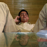 第二天,柬华楼门前围聚了很多人,还有救护车,不少晕倒的人被救护车抬走。杨骏刘佳悦走前一看,连见惯恐怖的他们都觉得有阵恶心感。昨天最后从大木门中穿过的那个小男孩的尸体正被挂在柬华楼的木牌下,眼睛流着血,在风中摇晃着。